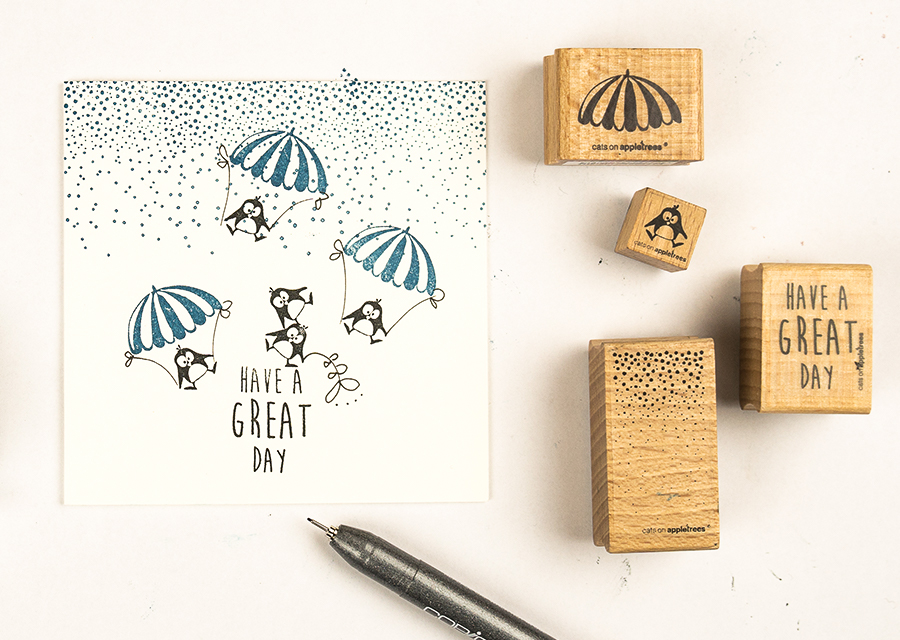 5. Stempel: Ministempel Pinguin Ole, Textstempel ‚Have a great day‘, einen Regenschirm und der Konfettiregenstempel